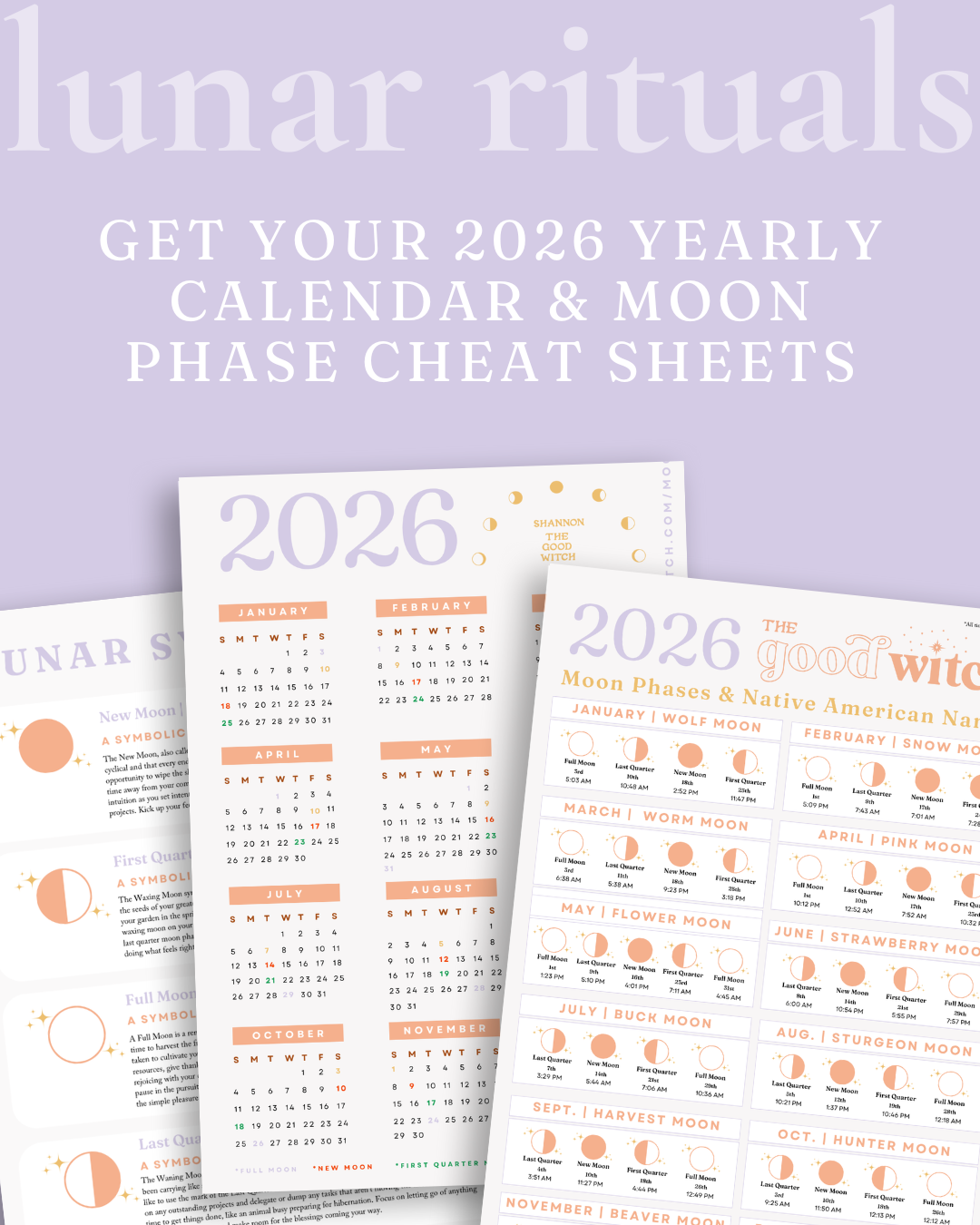 This 6 page PDF includes a glance at the year of 2026, highlighting the dates and times of every New Moon, First Quarter Moon, Full Moon, and Last Quarter Moon so that you can plan your rituals accordingly. It also includes the traditional Native American Names of each month’s moon. You will also find symbolism and guidance for each moon phase so that you can invite more ease and flow into your daily life.